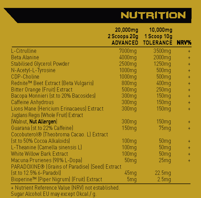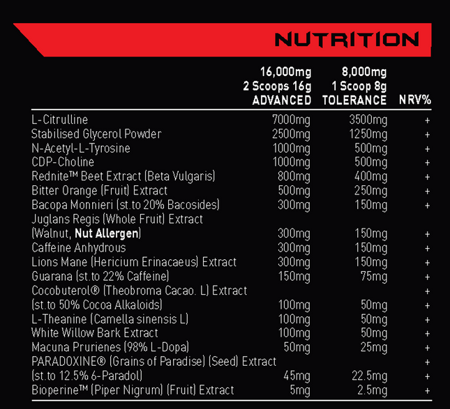 This non stimulant, high nootropic & nitric oxide increasing powerhouse contains 5 trademark ingredients such as CognatiQ® & Vitacholine® to dramatically increase focus and mental clarity as well as a big dose of Amentopump® & Rednite® Each tub contains 20 full servings. The following doses are based on a 20.5g (2 scoop serving) from the 410g tub; 7000mg L-Citrulline: The main staple to most pre workouts, this amino acid will offer reduced fatigue and supports elevated levels of nitric acid which at the dose given will provide huge muscle pumps. 3000mg Betaine Anhydrous: This ingredient offers excellent benefits such as increased hydration, strength & improved muscle building and work capacity as well as other performance benefits. 2500mg L-Tyrosine: This amino is added to significantly boost both focus, alertness & at this dose, should help provide powerful mood effects. L-Tyrosine is a precursor to a number of certain neurotransmitters such as dopamine, epinephrine and norepinephrine. Tyrosine can also alleviate some ADHD symptoms with its cognitive benefits. a very powerful addition for mood & powering through workouts with the help of catecholamine production. 2000mg Taurine: Can improve hydration, Can help increase energy and offer cognitive support, this amino acid can help provide energy, improve memory and neutralise free radicals which helps with stress and due to its osmotic effects can optimise hydration for max performance. 1000mg Rednite®: One more nitrate, This patented beetroot extract was a must, a great source of dietary nitrates that will convert into nitric acid to further support huge pumps in the gym as well as other potential health benefits. 500mg Himalayan Pink Salt: Added to ensure hydration and electrolytes are balanced to ensure peak performance, we also added this to further ensure there was adequate water held in the body to further facilitate the goal here and that's getting pumped! 500mg Vitacholine®: This patented form of Choline Birtartrate can provide increased brain function by being the precursor to the neurotransmitter acetyl choline, this can help with really focusing and tunnel visioned into the gym session. its also worth noting its vast array of benefits involving the optimal muscle function, liver health & decreasing oxidative stress in the body. 500mg Pine Bark Extract: The main benefit of pine bark is its purported ability to vastly increase nitric oxide production & improve blood flow which will lead to bigger pumps and greater recovery due to more nutrients delivered to the muscles. Pine bark also contains various plant compounds such as polyphenols which act as antioxidants & can help with general health and decreased inflammation. 300mg Amentopump®(20% amentoflavones): we have used the strongest form to yield the most amentoflavone which can help enhance strength, recomposition, increased blood flow and insulin sensitivity, used at the top end dosage! 100mg Cognatiq®: a patented coffee fruit extract which has been shown to boost BDNF, increase brain connections & improve our cognitive function such as factors like alertness, concentration and this can help with mind/muscle connection. 35mg Astragin®: this ingredient has been added to ensure absorption and uptake of this stacked panel is optimised to deliver the best results. Directions for use; Optimal results will be achieved using 2 scoops (20.5g serving) with 500-600ml of water, approximately 25-35 mins before training. This slightly extended time is to allow arginine levels to rise in the blood once L Citrulline is absorbed. Although, after 10-15 minutes, you will feel the surge of nootropics hit and want to get going! Good focus, pumps and results will still be achieved on half servings. Warning: Food supplements should not be used as a substitute for a varied, balanced diet. Not recommended for use by anyone under 18 years of age. Consult your doctor prior to use if you are taking any medication or suffer from any pre-existing medical conditions. Not suitable for children or pregnant or breastfeeding women. VitaCholine® is a registered trademark of Balchem Corporation RedNite® is a registered trademark of Enovate Bio Life Pvt. Ltd Amentopump® is a registered of Win Health International Co. Ltd.  AstraGin® is a registered trademark of NuLiv Science, USA Inc. CognatiQ® is a registered trademark of VDF Futureceuticals, inc.