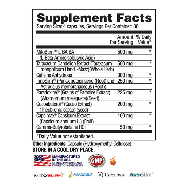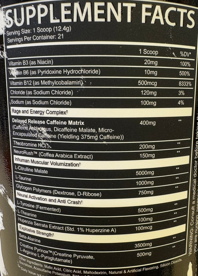 Inhuman Pyro awakens the dormant fire within, transforming your metabolism into an all-consuming blaze. Feel the electrifying pulse of energy and the sharpened clarity that propel you into uncharted territories of power and intensity. As barriers between mind and body fade, you become an unstoppable force. Yet, tread carefully – this potent elixir taps into the shadowy depths of our nature. Harness its power with caution, for the darkness within may awaken. Embrace the inferno, transcend your limits, and let Inhuman Pyro guide you through the flames. 🔥 Rage & Energy Complex Delayed-Release Caffeine Matrix – Steady energy, no sudden crash. Theobromine HCl – Gentle, long-lasting energy and mood support. NeuroRush (Coffee Extract) – Natural caffeine + antioxidants for clean alertness. Yohimbine HCl & Alpha Yohimbine – Boost fat burning, energy, and focus. 💪 Muscular Volumization & Strength L-Citrulline – Bigger pumps, better blood flow, more endurance. Beta-Alanine – Buffers lactic acid, delays fatigue, boosts performance. 🔥 Advanced Thermogenesis CapsiBurn – Pepper extract to increase calorie burn and metabolism. CaloriBurn GP – Activates fat-burning brown fat tissue. ProGBB – Supports carnitine production, enhances fat use for energy. 🧠 Neural Activation & Anti-Crash L-Tyrosine – Improves focus and stress response. Choline Bitartrate – Supports mental clarity and concentration. DMAE – Enhances alertness and mood. L-Theanine – Smooth energy, reduces jitters.