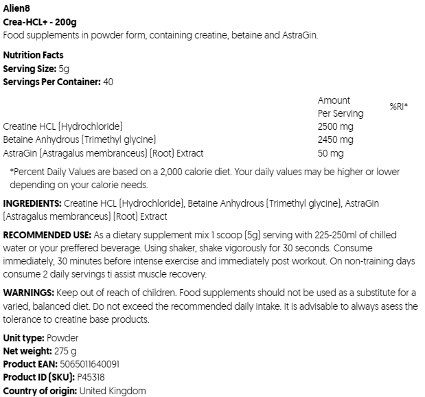 Alien8 Crea-HCL+ – Advanced Creatine for Peak Performance Fuel Your Muscles, Enhance Your Strength, and Maximize Your Performance! 🚀 Experience the next level of creatine supplementation with Alien8 Crea-HCL+. This premium formula combines Creatine HCL, Betaine Anhydrous, and AstraGin® to deliver superior absorption, increased strength, and optimized endurance. Say goodbye to bloating and water retention—Crea-HCL+ ensures rapid muscle uptake for peak performance. 💪 Key Benefits: ✅ Highly Absorbable Creatine HCL – Delivers a concentrated dose for faster absorption and greater bioavailability than traditional creatine monohydrate.✅ Boosts Strength & Power – Supports ATP production, fueling explosive lifts, high-intensity training, and endurance.✅ Betaine Anhydrous for Performance – Enhances muscle hydration, endurance, and recovery, helping you train harder for longer.✅ AstraGin® for Maximum Absorption – A patented extract that optimizes nutrient uptake, ensuring your body utilizes every gram efficiently.✅ Minimise Bloat, No Loading Phase – Unlike monohydrate, Crea-HCL+ requires no loading phase and minimises bloating, making it ideal for serious athletes. 🚀 DOMINATE EVERY WORKOUT WITH ALIEN8 CREA-HCL+! Designed for serious lifters, endurance athletes, and anyone looking to maximize muscle gains, Crea-HCL+ is your ultimate performance enhancer. 🔹 No Loading, Minimise Bloat, Just Pure Power!🔹 Supports Muscle Growth, Strength & Recovery!🔹 Scientifically Formulated for Superior Absorption! 💀 UNLEASH YOUR TRUE STRENGTH – GET ALIEN8 CREA-HCL+ TODAY! 💀 Suggested Use Mix 1 scoop (5g) with 225-250ml of water or your favorite beverage. Shake vigorously for 30 seconds and consume: Pre-Workout: 30 minutes before training for an explosive energy boost. Post-Workout: Immediately after training for faster muscle recovery. On Rest Days: Take two servings daily to maintain muscle saturation.