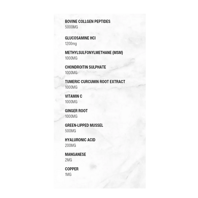 Revitalize Your Joints with Alpha Neon's 'Syner-Joint' Alpha Neon's 'Syner-Joint' is your comprehensive solution for promoting joint health and mobility. Crafted with a potent blend of natural ingredients, this joint support supplement is designed to keep you moving comfortably and pain-free. Key Ingredients for Joint Wellness: Bovine Collagen Peptides (5000mg): Collagen is a building block of joint tissues, promoting flexibility and reducing stiffness. Glucosamine HCL (1200mg): Glucosamine supports cartilage health and helps reduce joint discomfort. Methylsulfonylmenthane (MSM) - (1000mg): MSM aids in reducing inflammation and improving joint flexibility. Chondroitin Sulphate (1000mg): Chondroitin helps maintain cartilage and supports joint lubrication. Turmeric Curcumin Root Extract (1000mg): Turmeric's anti-inflammatory properties assist in easing joint pain and discomfort. Vitamin C (Ascorbic Acid - 1000mg): Vitamin C is essential for collagen production and cartilage maintenance. Ginger Root (1000mg): Ginger has anti-inflammatory properties and can alleviate joint pain. Green-Lipped Mussel (500mg): Rich in Omega-3 fatty acids, green-lipped mussel aids in joint lubrication. Hyaluronic Acid (200mg): Hyaluronic acid supports joint cushioning and reduces friction. Manganese (2mg): Manganese plays a role in cartilage formation and maintenance. Copper (1mg): Copper supports the formation of collagen and connective tissues. Restore Comfort, Reclaim Mobility: Alpha Neon's 'Syner-Joint' is your key to comfortable, pain-free movement. Whether you're an athlete or simply want to maintain an active lifestyle, this formula has you covered.