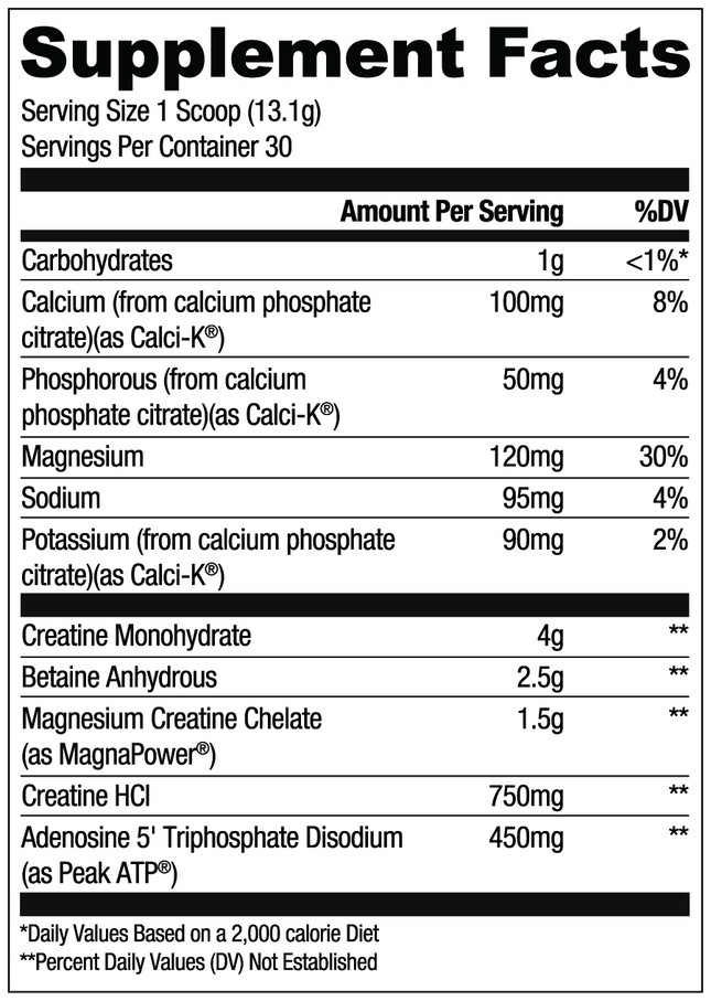 It's time to reach your maximum potential with RYSE Loaded Creatine. This versatile formula was designed to enhance strength, power, and endurance leading to your best self. It's time to maximize those gains and RYSE above. Ingredient Highlights: Creatine Monohydrate (4,000mg): The gold standard of creatine to enhance energy, strength, and muscular endurance. Betaine Anhydrous (2,500mg): A multipurpose molecule that increases the body's production of creatine, cellular hydration, and overall exercise performance. Magna Power® (1,500mg): A unique molecule featuring creatine chelated to magnesium which offers the dual benefits of increased creatine absorption and the performance benefits of the essential electrolyte. Creatine HCL (750mg): An additional source of creatine to ensure maximum absorption. PeakATP® (450mg): A biologically identical form of Adenosine 5º-Triphosphate (ATP) that offers immediate functional energy. As creatine acts as a precursor to the body's main energy source (ATP), PeakATP® provides ATP directly to the body for increased energy and endurance.