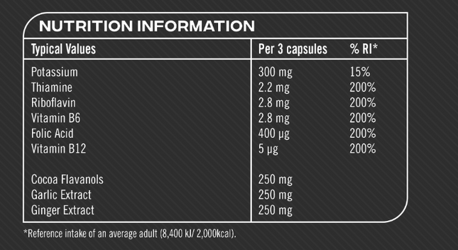 Unlock the power to a healthier heart with Heart Pro, a revolutionary supplement meticulously crafted to support your cardiovascular well-being. Our expertly blended formula combines potent natural ingredients with essential vitamins to create a holistic approach to heart care. • 300mg Potassium Citrate: A vital mineral that plays a crucial role in maintaining healthy blood pressure levels, supporting optimal heart function1 • 250mg Cocoa Extract: Harnessing the goodness of cocoa's flavanols, this extract offers potent antioxidant properties that promote healthy circulation and cardiovascular vitality2 • 250mg Garlic Extract: Known for centuries for its heart-friendly benefits, garlic extract contributes to healthy cholesterol levels and overall cardiovascular health3 • Vitamin B6: A key player in supporting normal red blood cell formation, supporting your heart's optimal performance. • Vitamin B2 (Riboflavin): Contributing to normal energy-yielding metabolism, ensuring your heart has the stamina it needs. • Vitamin B1 (Thiamine Hydrochloride): supports the normal functioning of the heart for an active lifestyle. • Vitamin B9 (Folic Acid): Promoting homocysteine regulation, supplementation with folic acid (Vitamin B9) leads to a significant reduction in homocysteine levels - High homocysteine levels are associated with an increased risk of cardiovascular disease, and reducing these levels can contribute to a heart-healthy environment5