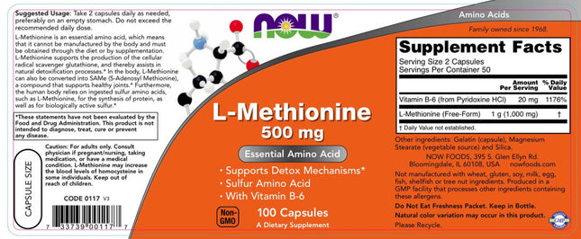 L-Methionine is an essential amino acid, which means that it cannot be manufactured by the body and must be obtained through the diet or by supplementation. L-Methionine supports the production of the cellular radical scavenger glutathione, and thereby assists in natural detoxification processes. In the body, L-Methionine can also be converted into SAMe (S-Adenosyl Methionine), a compound that supports healthy joints. Furthermore, the human body relies on ingested sulfur amino acids, such as L-Methionine, for the synthesis of protein, as well as for biologically active sulfur.