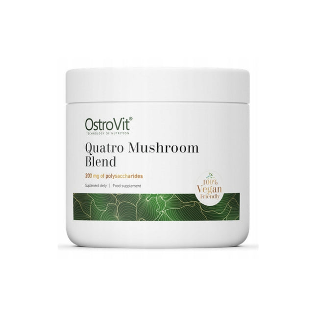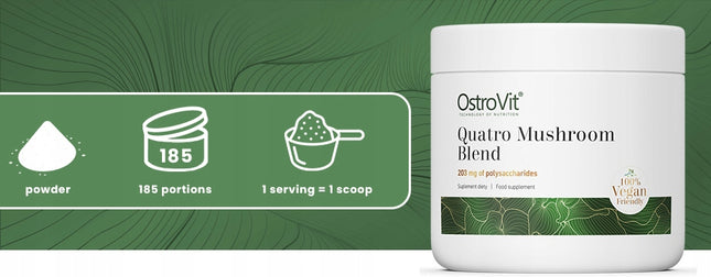 OstroVit Quatro Mushroom Blend Vege is a unique combination of extracts from four different mushrooms - reishi, lion's mane, cordyceps and chaga. It is a preparation available in a convenient powder form, created for people who care about supplementing their diet with natural, valuable ingredients. Source of extracts from four Asian mushrooms - a serving of the dietary supplement provides the body with 135 mg of reishi mushroom extract standardized to 40% polysaccharides, 135 mg of lion's mane extract standardized to 30% polysaccharides, as well as 135 mg of cordyceps mushroom extract standardized to 40% polysaccharides and 135 mg of chaga mushroom extract standardized to 40% polysaccharides. 1 serving = 1 scoop. Performance - the product package contains 185 servings of the product, which is enough for more than half a year of regular supplementation. Convenient form - the preparation, available in powder form, provides a hassle-free supply of the dietary supplement and will be great for people who have difficulty swallowing tablets. Suitable for vegetarians and vegans - the product does not contain ingredients of animal origin. OstroVit Quatro Mushroom Blend VEGE - a comprehensive combination of valuable ingredients Reishi - Ganoderma lucidum - a species of fungus native to Asia, belonging to the family Polyporaceae. It is also known as reishi, and in Poland also referred to as lacquered bracket fungus, which refers to the mushroom's shiny surface. Reishi grows mainly on deciduous tree species and can usually be found on dead plant parts. Due to its bitter taste, it is considered an inedible species of fungus, but thanks to its wealth of active substances, it is used as an ingredient in dietary supplements. Lion's mane - Hericium erinaceus - a species of Asian fungus of the family Hericiaceae. It is an edible fungus that is usually found in deciduous forests, growing primarily on weak, old or dead trees. It is a product that stands out for its distinctive appearance - after all, it is referred to as a lion's mane for a reason, as well as its unique aroma, which is reminiscent of the taste of seafood. Cordyceps - Cordyceps sinensis - a species of parasitic fungus, belonging to the family Ophiocordycipitaceae. It occurs naturally in the Tibetan Plateau, in the highest parts of the mountains, at an altitude of approx. 3- 4 thousand meters above sea level. For growth and development, the cordyceps uses caterpillars of the genus Thitarodes, usually located several centimeters underground. The mycelium, extracting nutrients from the larvae, moves towards the surface of the earth, and then grows a fruiting plant, which resembles a small club bell. Cordyceps is distinguished by its slightly bitter taste and meaty smell. The mushrooms of cordyceps are a rich source of biologically active substances - the fungus contains, among others, nucleotides, amino acids and polysaccharides, which make cordyceps often used as a component of dietary supplements.   Chaga - Inonotus obliquus - a species of fungus of the family Hymenochaetaceae, also known as chaga or birch polypore, which results from the fact that the chaga grows mainly in birches, although sometimes also occurs on other deciduous tree species. It is a parasitic fungus that grows mainly in northern China and Siberia. It has been appreciated in traditional folk medicine for hundreds of years due to its wealth of biologically active substances. The extracts from Asian mushrooms used in OstroVit preparation are standardized for a specific content of polysaccharides, which positively affects the quality of the dietary supplement and ensures the same amount of substances in each serving of the product.
