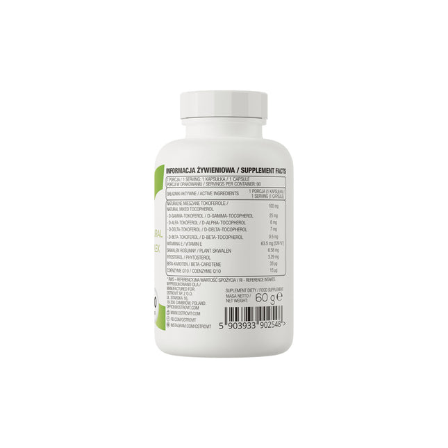 OstroVit Vitamin E Natural Tocopherols Complex is a dietary supplement containing a set of valuable ingredients. In the preparation you can find compounds such as fat-soluble vitamin E, natural tocopherols, as well as plant squalene, phytosterol, beta-carotene or coenzyme Q10. It is a product available in the form of easy-to-swallow capsules, which is a valuable addition to the daily diet. Source of vitamin E - one portion of the preparation contains 63. 5 g of D-alpha-tocopheryl acetate. Contains a complex of natural tocopherols - a serving of dietary supplement provides the body with 25 mg d-gamma-tocopherol, 16 mg d-alpha-tocopherol, 7 mg d-delta-tocopherol and 2 mg d-beta-tocopherol. Enriched with plant squalene, phytosterol as well as beta-carotene and coenzyme Q10. 1 serving = 1 capsule. Performance - packaging of the preparation is enough for three months of regular supplementation. Convenient form - product available as easy-to-swallow capsules.