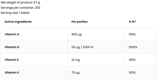 A source of fat-soluble vitamins - The preparation contains 800 ug of vitamin A, 2000 IU of vitamin D, as well as 12 mg of vitamin E and 75 ug of vitamin K. 1 serving = 1 tablet. Efficiency - The package of the preparation contains 200 portions of the product, which is enough for over half a year of regular supplementation. Convenient form - Dietary supplement available in the form of easy-to-swallow tablets. Vitamin A is a carotene derivative belonging to the group of carotenoids. It is a component classified as fat-soluble vitamins, which is accumulated in the human body in the liver and adipose tissue. Naturally found in food, the ingredient can be found in products such as offal, milk and dairy products, vegetables (e.g. carrots, sweet potatoes, pumpkin) and fruit (e.g. peaches). Vitamin D is a steroid, organic chemical compound, classified as fat-soluble vitamins, which bioavailability, like other compounds in this group, is closely related to the presence of fats in the daily diet. Vitamin D can be supplied to the body with food - It occurs mainly in fatty sea fish, as well as in the form of dietary supplements. On sunny days, skin synthesis of the compound is also possible. Vitamin E is a group of organic chemical compounds, classified as fat-soluble vitamins. It is a compound, which in the human body is stored primarily in adipose tissue, as well as in the adrenal glands. Dietary sources of vitamin E include vegetable oils, i.a. olive oil and sunflower oil, as well as nuts and germs of cereal seeds. Vitamin K is a group of fat-soluble chemical compounds. OstroVit dietary supplement uses menaquinone, i.e. vitamin K2, which is produced by intestinal bacteria and can also be delivered to the body along with the daily diet - The compound is found in products such as spinach, lettuce, cauliflower or cereal products and is also available in the form of supplements.
