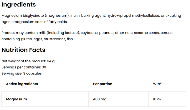 OstroVit Magnesium Glycinate is a high-quality dietary supplement, which is a source of magnesium in the form of magnesium bisglycinate. It is a preparation available in the form of easy-to-swallow capsules, created for people who want to supplement their daily diet with a valuable ingredient. A source of magnesium - One portion of the dietary supplement provides the body with 400 mg of the element in the form of magnesium bisglycinate. 1 serving = 3 capsules. Efficiency - The product packaging contains 30 portions of the preparation, which is enough for a month of regular supplementation. Convenient form - The preparation is available in the form of easy-to-swallow capsules ensures a trouble-free supply of a dietary supplement. Magnesium - chemical element with symbol Mg. A mineral component that is classified as macronutrients because it occurs in the human body in a significant amount. In human body, magnesium is stored mainly in bones and muscles and only 1% of the element is found in blood. It is a compound widely distributed in food, which is found in both animal and plant products. Nutritional sources of magnesium include whole grain cereal products, dry legume seeds, as well as nuts and green leafy vegetables. OstroVit preparation uses magnesium bisglycinate - Magnesium chelate, i.e. compound that combines magnesium with two molecules of the protein amino acid, which is glycine. Magnesium bisglycinate is a substance that is distinguished by high bioavailability and additionally does not contribute to the occurrence of digestive system ailments, which positively affects the quality of the product and the effectiveness of supplementation. Properties of ingredients contained in OstroVit Magnesium Glycinate: Magnesium contributes to the reduction of tiredness and fatigue and helps to maintain electrolyte balance. In addition, it supports the proper functioning of the nervous system and contributes to maintaining proper energy metabolism. Magnesium also supports proper muscle function and helps maintain healthy bones and teeth. In addition, it plays a role in the process of cell division and supports the preservation of optimal psychological functions.