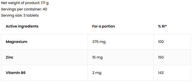 OstroVit MgZB Ultra is a high-quality dietary supplement that provides a set of three ingredients - magnesium, zinc and vitamin B6 in highly bioavailable forms. It is a preparation available in the form of easy-to-swallow tablets, designed for athletes and people who want to supplement their diet with valuable compounds. Source of three ingredients - one serving of the product provides the body with 375 mg of magnesium, 15 mg of zinc and 2 mg of vitamin B6. 1 serving = 3 tablets. Efficiency - the product package contains 40 servings of the preparation, which is enough for more than a month of regular supplementation. Convenient form - the preparation is available in the form of easy-to-swallow tablets provides a hassle-free suply for a trouble-free supply of the dietary supplement. Magnesium a chemical element with the symbol Mg. The mineral component that occurs in the body in significant amounts, which is why it is classified as a macronutrient. In the human body, the compound is stored mainly in the bones and muscles. Nutritional sources of magnesium are considered whole grain cereal products, as well as seeds and nuts. Zinc a chemical element withe the symbol Zn. It is a mineral component, classified as a micronutrient, which in the human body is found primarily in skeletal muscles and bones, and in smaller amounts also in the brain, pancreas or liver. It is a substance that can be found in a wide variety of foods, and red meat, poultry, dry pulses, nuts and whole grain cereal products are considered the main sources of zinc. Vitamin B6 Pyridoxine - a water-soluble component, belonging to the B vitamins, which must be supplied to the system from the outside, since the body is not capable of synthesizing it on its own. The compound is found primarily in whole grain cereal products, as well as in offal and dry pulses, and in dietary supplements. Properties of the ingredients contained in OstroVit MgZB Ultra Magnesium contributes to reducing feelings of fatigue and tiredness and helps maintain electrolyte balance. In addition, it supports the proper functioning of the nervous system and contributes to maintaining normal energy metabolism. Magnesium also supports the proper functioning of muscles and helps maintain healthy bones and teeth. In addition, it plays a role in the process of cell division and supports the maintenance of optimal mental functions. Zinc helps maintain normal acid-base balance, and moreover, supports the maintenance of optimal carbohydrate metabolism. It is a compound that helps maintain normal cognitive function and supports proper DNA synthesis. The mineral also supports the maintenance of normal fertility and reproductive function, and contributes to the maintenance of optimal macronutrient and fatty acid metabolism. In addition, it contributes to maintaining proper vitamin A metabolism and helps in proper protein synthesis. Zinc also helps maintain healthy skin, bones, nails and hair, and supports the proper functioning of the immune system. What's more, it helps maintain proper vision and supports the protection of cells from oxidative stress. Vitamin B6 contributes to the maintenance of normal energy metabolism and also supports the proper functioning of the nervous system. It is a compound that contributes to the maintenance of optimal protein and glycogen metabolism, and what's more, it helps in the proper production of red blood cells and affects the reduction of feelings of fatigue and tiredness. The compound also aids in the proper synthesis of cysteine and supports the maintenance of proper homocysteine metabolism and supports optimal immune system function.