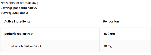 OstroVit Berberine VEGE is a dietary supplement that contains barberry root extract standardized to 2% berberine. It is a preparation available in the form of easy-to-swallow tablets, created for conscious consumers who want to supplement their daily diet with a valuable ingredient. Source of berberine - one serving of the dietary supplement contains 500 mg of barberry root extract standardized to 2% berberine. 1 serving = 1 tablet. Performance - the product package contains 90 servings of the preparation, which is enough for three months of regular supplementation. Convenient form - the preparation available in the form of easy-to-swallow tablets ensures trouble-free supply of dietary supplement. Berberine is a chemical compound included in the group of isoquinoline alkaloids. It is a natural substance of plant origin, which can be found in the roots, stems and fruits of shrubs of the barberry family. Berberine is a compound known primarily in European countries that is poorly soluble in water and alcohol. In dietary supplements can be found in various chemical forms - in preparations you can find berberine in the form of hydrochloride or sulfate, as well as in the form of a natural extract. The OstroVit product uses barberry root extract standardized to 2% berberine, which positively affects the quality of the dietary supplement and ensures a high content of active substance in each serving of the preparation.