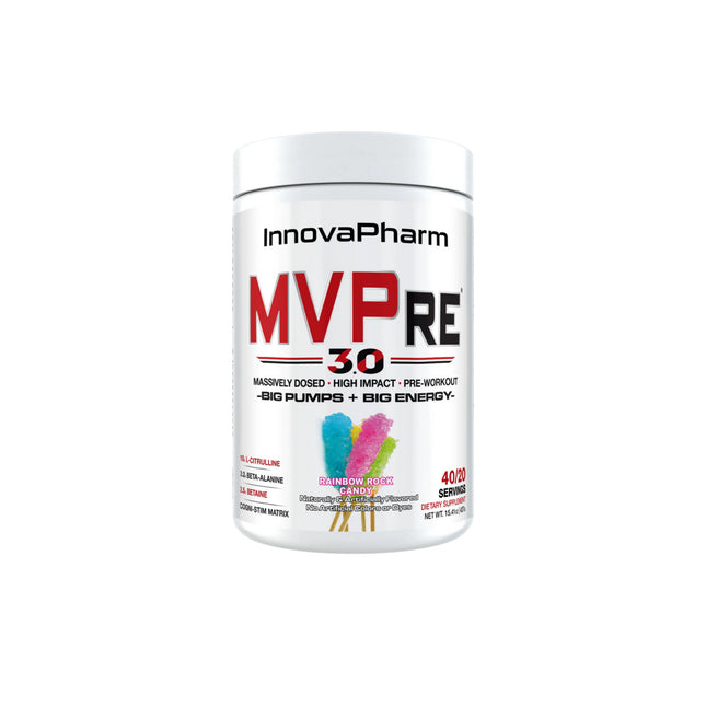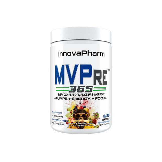 Innovapharm's MVPRE 365 Pre-Workout boasts enhanced pump and focus compared to MVPre 2.0. With a hard-hitting and no-nonsense formula, this everyday performance pre-workout is designed to elevate your workout routine