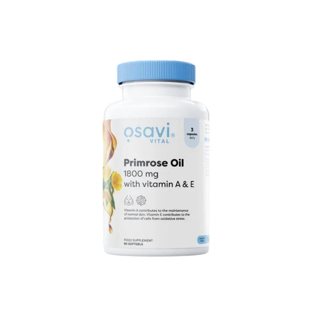 Softgel food supplement with cold pressed evening primrose oil standardised for the content of the essential fatty acid GLA. Enriched with vitamin A and vitamin E.