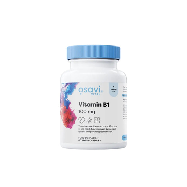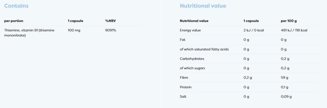 Food supplement in the form of a hard capsule containing thiamine mononitrate, a form of vitamin B-1 (thiamine). Vitamin B1 contributes to i.a. normal energy-yielding metabolism.