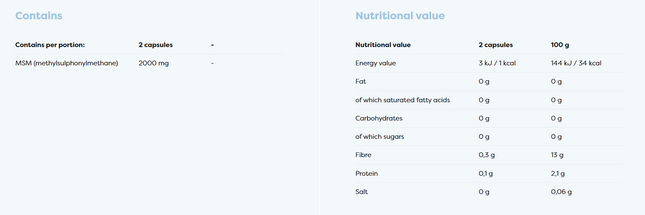 Food supplement in the form of a hard capsule containing methylsulphonylmethane, an organic sulphur compound. Sulphur is an important component of proteins, including collagen and keratin, as well as some hormones and enzymes.