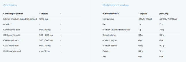 What is special about softgels MCT Oil 1000 mg?- High concentration of caprylic (C8) and capric (C10) acids.- The MCT oil contained in the supplement is obtained only from 100% oil produced from the fruit of coconut palm Cocos nucifera.- Palm oil free, sugar-free, gluten-free, lactose-free, soy-free, GMO-free.- Medium chain fatty acids are easily absorbed by the intestinal villi.- Packaging made of BioPET (30% of the plastic comes from sugar cane).[1] Nimbkar S. et. al. (2022). Medium chain triglycerides (MCT): State‐of‐the‐art on chemistry, synthesis, health benefits and applications in food industry. Comprehensive Reviews in Food Science and Food Safety, 21(2), 843-867. https://doi.org/10.1111/1541-4337.12926. [2] Mumme K, Stonehouse W. (2015). Effects of medium-chain triglycerides on weight loss and body composition: a meta-analysis of randomized controlled trials. J Acad Nutr Diet.; 115(2):249-263. doi: 10.1016/j.jand.2014.10.022. [3] Wang Y. et. al. (2018). Medium Chain Triglycerides enhances exercise endurance through the increased mitochondrial biogenesis and metabolism. PLoS One; 13(2):e0191182. doi: 10.1371/journal.pone.0191182. [4] Kinsella R., Maher T. & Clegg M. E. (2017). Coconut oil has less satiating properties than medium chain triglyceride oil. Physiology & Behavior, 179,422-426. https://doi.org/10.1016/j.physbeh.2017.07.007. [5] Marten B., Pfeuffer M. & Schrezenmeir J. (2006). Medium-chain triglycerides. International Dairy Journal, 16(11), 1374-1382. https://doi.org/10.1016/j.idairyj.2006.06.015. [6] Lemarié F. et. al. (2016). Revisiting the metabolism and physiological functions of caprylic acid (C8: 0) with special focus on ghrelin octanoylation. Biochimie, 120, 40-48. https://doi.org/10.1016/j.biochi.2015.08.002. [7] Huang W. C. et. al. (2014). Anti-bacterial and anti-inflammatory properties of capric acid against Propionibacterium acnes: a comparative study with lauric acid. Journal of dermatological science, 73(3), 232-240. https://doi.org/10.1016/j.jdermsci.2013.10.010.