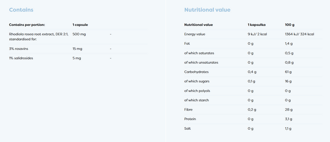 Food supplement in the form of a hard capsule containing Rhodiola rosea root extract, standardised for rosavins and salidrosides. Rhodiola rosea has adaptogenic properties.