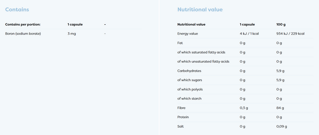 Food supplement in the form of a hard capsule containing boron in sodium borate form.Boron is an important trace mineral and small amounts are found in the human body.