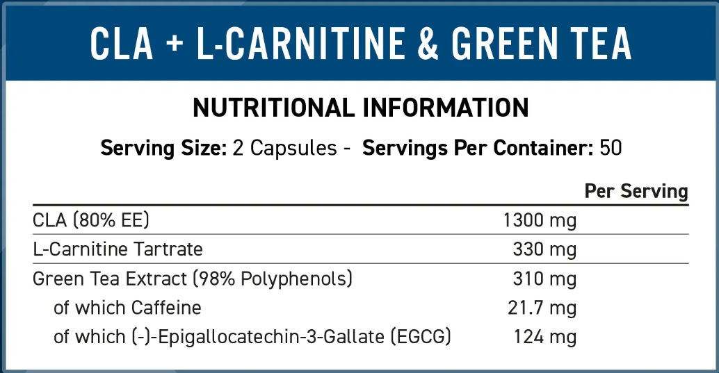 Ingredients: CLA, L-Carnitine Tartrate, Green Tea Extract