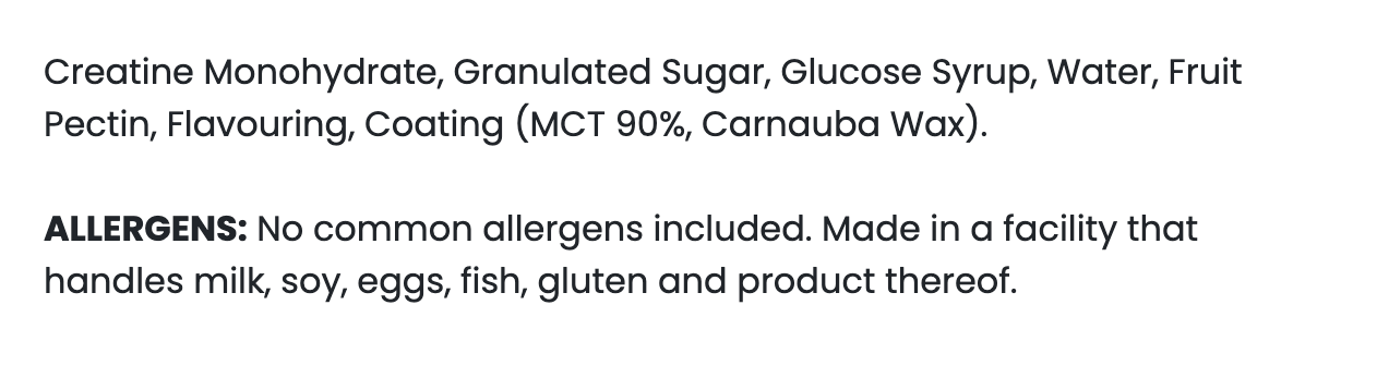 Ingredients: Creatine Monohydrate, Gransulated Sugar, Glucose Syrup, Water Fruit Peclin, Flavouring