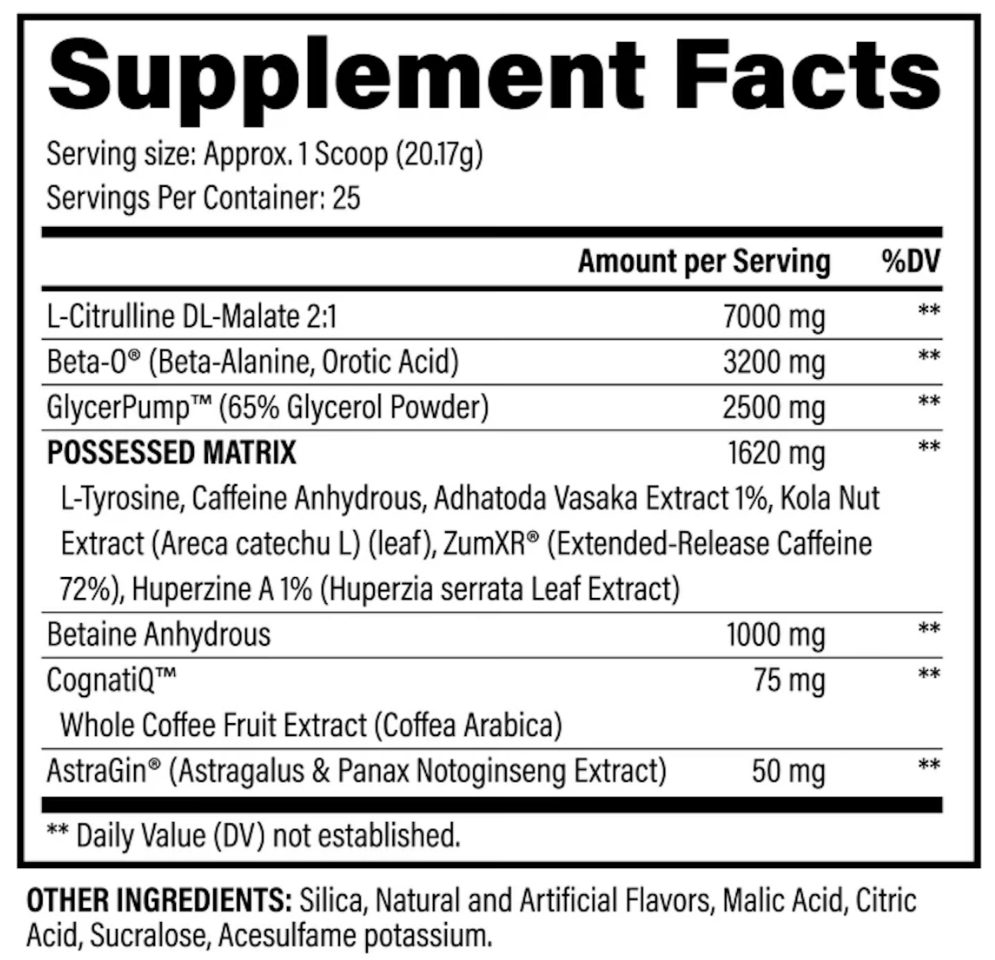Ingredients: L-Citrulline DL-Malate 2:1, Beta Alanine, Orotic Acid, Glycerol Powder, Betaine Anhydrous, CognatiQ, AstraGin