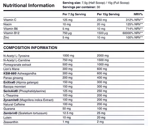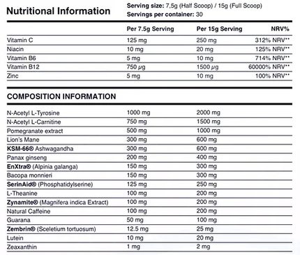 Ingredients: Vitamin C, Niacin, Vitamin B6, Vitamin B12, Zinc, N-Acetyl L-Tyrosine, N-Acetyl L-Carnite, Promegranate extract, Lion's Mane, KSM-66, Panax ginseng, EnXtra, Bacopa monnleri, SerinAid, L-Theanine, Zynamite, Natural Caffeine, Guarana, Zembrin, Lutein, Zeaxanthin