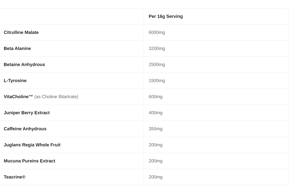 Ingredients: Citrulline Malate, Beta Alanine, Betaine Anhydrous, L-Tyrosine, VitaCholine, Juniper Berry Extract, Caffeine Anhydrous, Juglans Regia Whole Fruit, Mucuna Pureins Extract, Teacrine