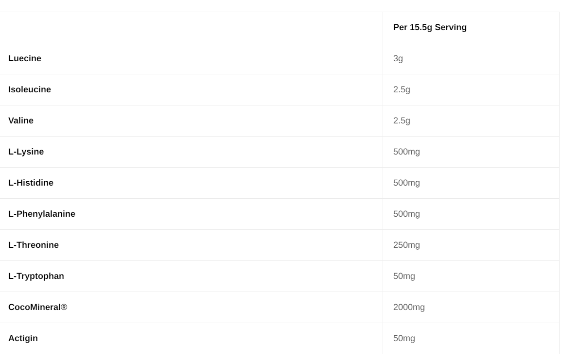 Ingredients: Leucine, Isoleucine, Valine, L-Lysine, L-Histidine, L-Phenylalanine, L-Methionine, L-Threoine, L-Tryptophan, Cocomineral, Actigin