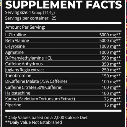 Ingredients: L-Citrulline, Beta Alanine, L-Tyrosine, Agmatine Sulfate, Beta PEA, Caffeine Anhydrous, 2-Amino, Theobromine, Di-Caffeine Malate, Caffeine Citrate, Halostachine, Kanna Extract, Bioperine