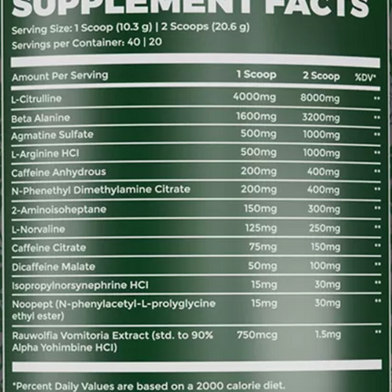 Ingredients: 2-Amino, Caffeine Citrate, L-Norvaline, L-Citrulline, Beta Alanine, Agmatine Sulfate, L-Arginine HCl, Noopept