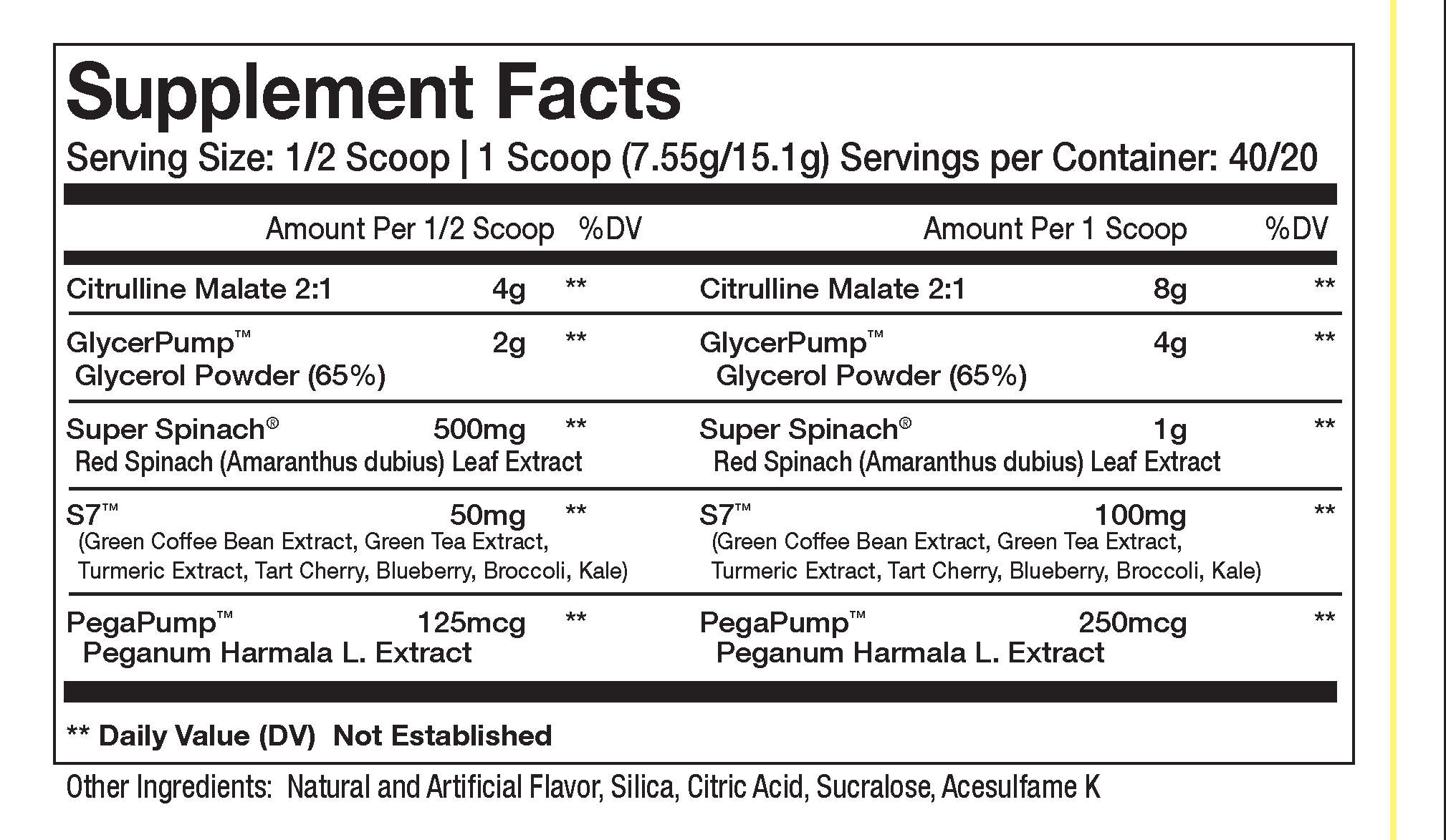Ingredients: Citrulline Malate 2:1, GlycerPump, Super Spinach, PegaPump