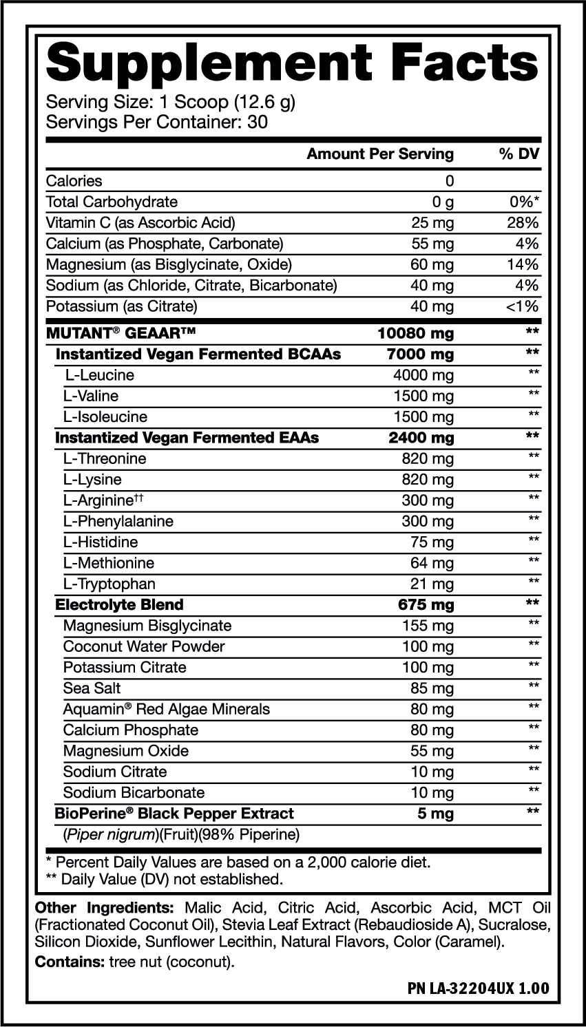 Research has proven that 9 Essential Amino Acids (EAAs) and Arginine are needed for muscle growth and recovery. GEAAR was formulated with vegan fermented EAAs (including 7 grams of BCAAs) and Arginine which is a Conditionally Essential Amino Acid (CEAA). Arginine is needed in large supply during overtraining. GEAAR also delivers 4 grams of Leucine for maximum results and the patented absorption-enhancing compound BioPerine. With added electrolytes from coconut water, GEAAR is seriously dosed for serious results
