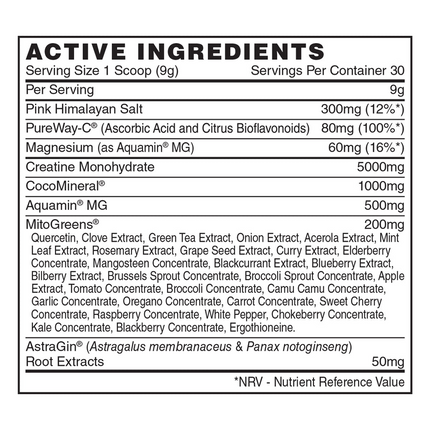 Ingredients: Pink Himalayan Salt, PureWay, Magnesium, Creatine Monohydrate, CocoMineral, MitoGreens, AstraGin