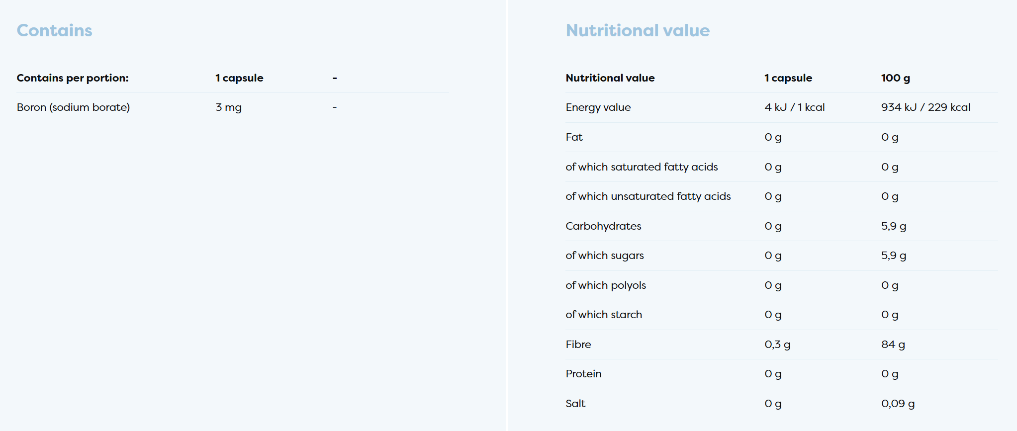 Food supplement in the form of a hard capsule containing boron in sodium borate form.Boron is an important trace mineral... Read more