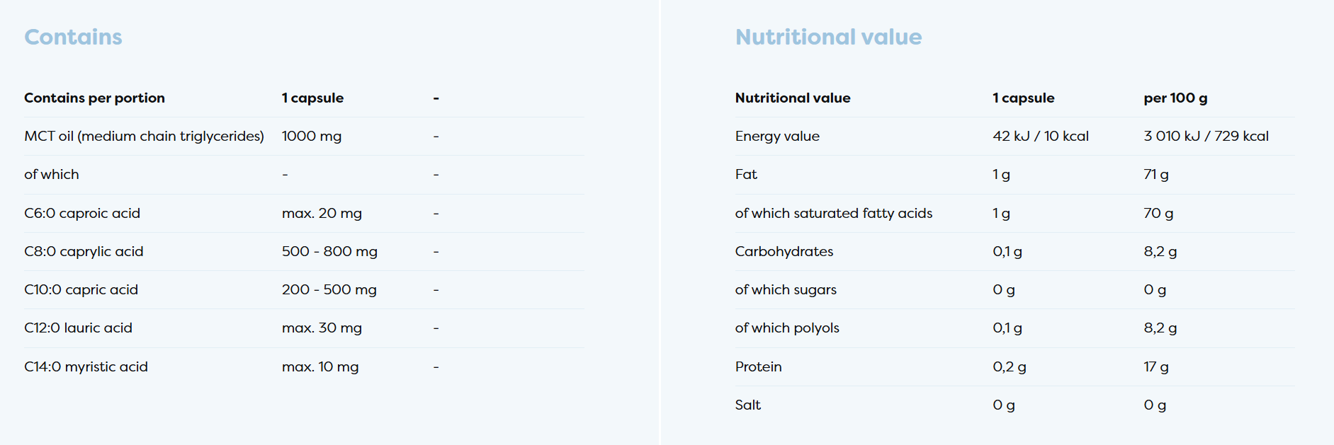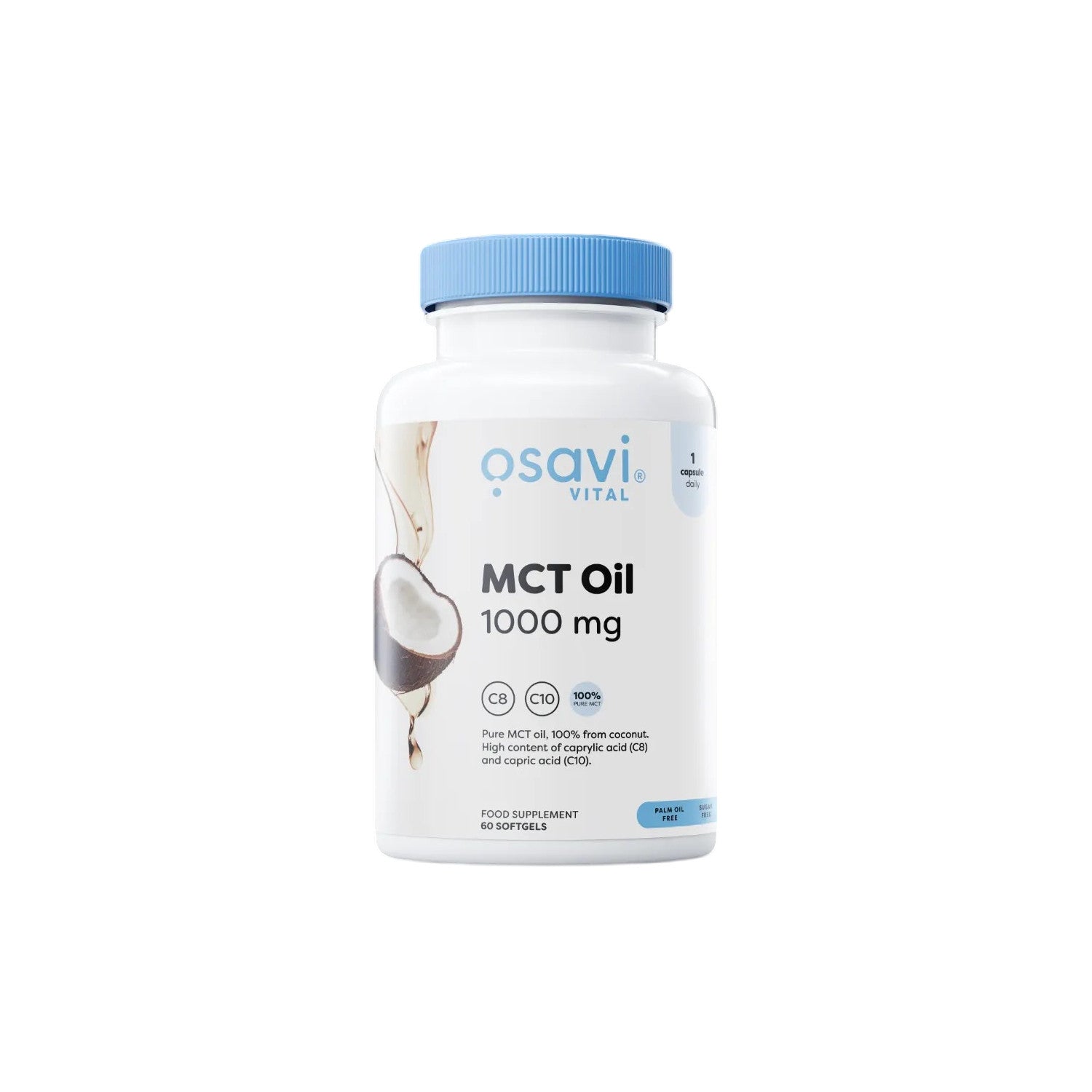Softgel food supplement capsule with pure 100% MCT oil from coconut (Cocos nucifera) with high C8 - caprylic acid and C10 - capric acid content. Free from palm oil.
