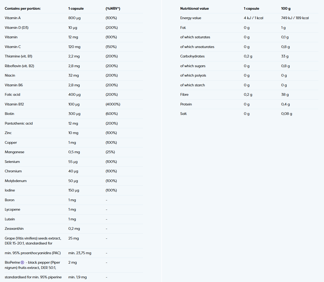 Ingredients: L-ascorbic acid, Inulin, Nicotinamide, Zinc Citrate, Grape Seed Extract, Tomato Fruit Extract, D-alpha-tocopheryl acid succinate, Standardised for Lycopene, D-pantothenate calcium, L-selenomethionine, Sodium Borate, Retinyl Acetate, Cholecalciferol, Marigold Flower Extracts, Standardised for Lutein and Zeaxanthin, Pyridoxine Hydrochloride, Riboflavin, Thiamine Mononitrate, Cupric Citrate, Manganese Citrate, Black Pepper Fruit, Calcium-L-methylfolate, D-biotin, Chromium Picolinate, Potassium Iodide, Sodium Molybdate, Methylcobalamin