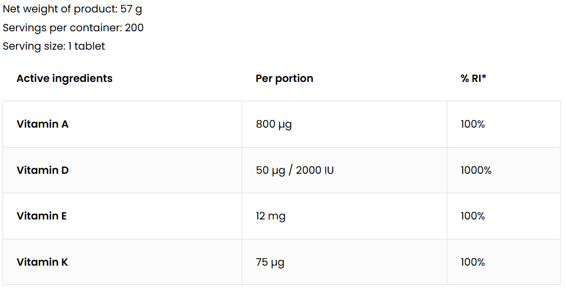 Ingredients: Vitamin A, Vitamin D, Vitamin E, Vitamin K