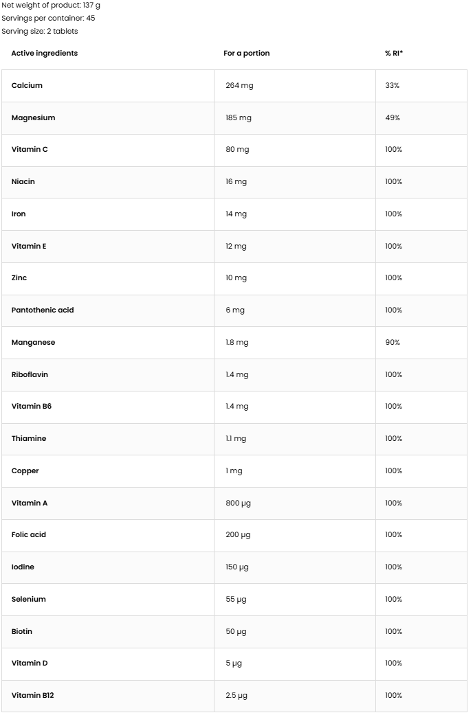 Vitamin A helps to maintain normal vision, then vitamin C supports the proper production of collagen to ensure optimal functioning of blood vessels, bones, cartilage, teeth, gums and skin. Vitamin D helps to maintain healthy bones and teeth and helps to proper muscle work, and vitamin E supports the protection of cells against oxidative stress. Vitamins of group B, such as thiamine or riboflavin, contribute to the reduction of tiredness and fatigue, then magnesium supports the proper functioning of the nervous system, and copper helps maintain proper pigmentation of the skin and hair. Manganese helps in the proper formation of connective tissues, and iron supports the maintenance of optimal cognitive functions. Iodine contributes to the maintenance of normal energy metabolism, and selenium supports the proper functioning of the thyroid gland. In turn, calcium helps in the proper functioning of digestive enzymes and zinc supports the proper synthesis of DNA.