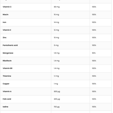 Ingredients: Zinc, Calcium, Magnesium, Vitamin C, Niacin, Iron, Vitamin E, Pantothenic Acid, Manganese, Riboflavin, Vitamin B6, Thiamine, Copper, Vitamin A, Folic Acid, Iodine, Selenium, Biotin, Vitamin D, Vitamin B12