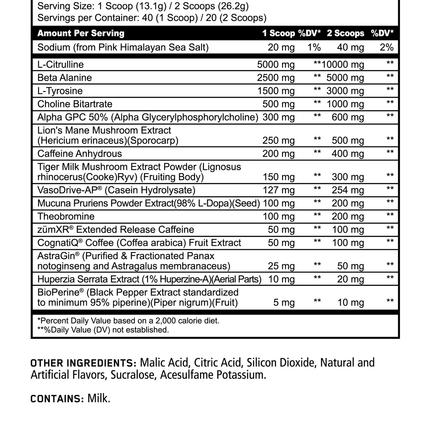 Transcend the boundaries of a normal pre-workout and unleash nootropic focus like you have never experienced before. This loaded pre-workout comes in a brand new flavor Lemon Key Lime Cherry to give you a hint of sweet with a blend of Key Lime to leave you coming back for more each and every time. Our formulations deliver excellence and this is no exception! Experience ingredients like L-Tyrosine and Alpha GPC for hyper focus. Pair that with L-Citrulline, VasoDrive AP to power your pump, and oh yeah, kick start your mental cognition with powerful ingredients like CognatiQ™ and Lions Mane to cap off this absolutely unreal formulation.