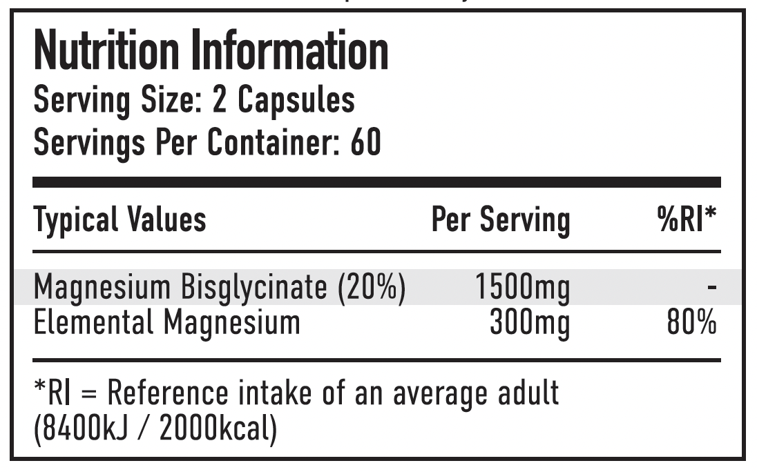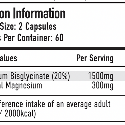 Ingredients: Magnesium Bisglycinate , Magnesium Stearate, Hydroxypropyl Methylcellulose Capsule