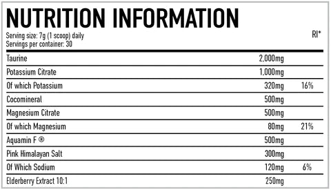 Ingredients: Taurine, Potassium Citrate, Cocomineral, Magnesium Citrate, Aquamin, Pink Himalayan Salt, Elderberry Extract