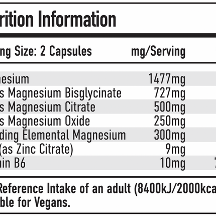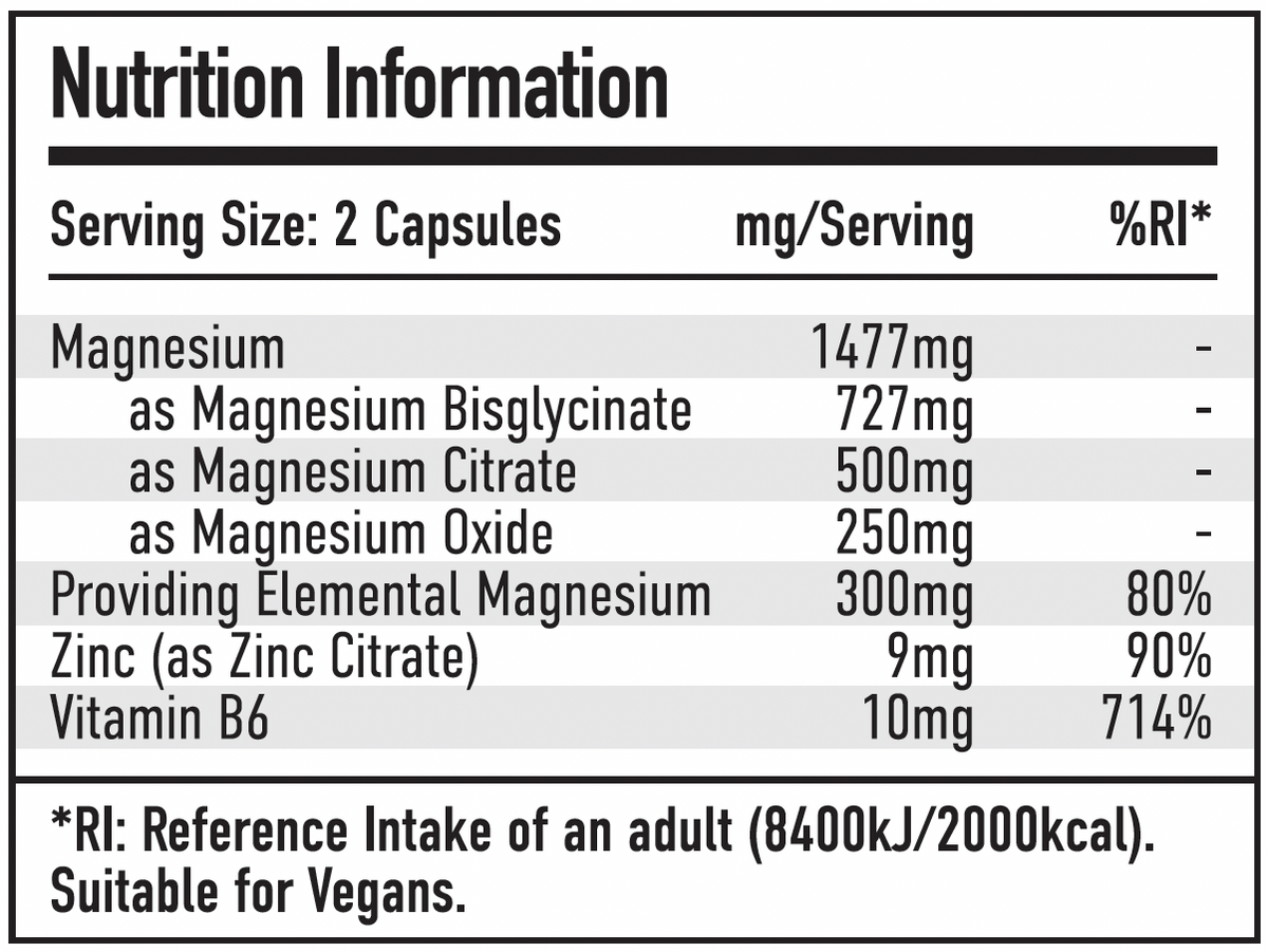 Ingredients: Zinc, Magnesium Bisglycinate, Magnesium Citrate, Magnesium Oxide, Vitamin B6