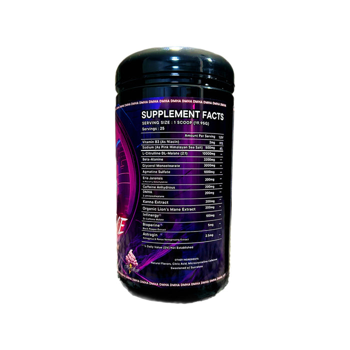 Ingredients: L-Citrulline DL-Malate, Beta Alanine, Glycerol Monosterate, Agmatine Sulfate, Eria Jarensis, 2-Amino, Caffeine Anhydrous, Kanna Extract, Organic Lion's Mane Extract, Infinergy, Bioperine, Astragin