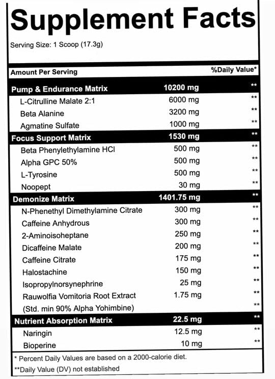 Where Demonize truly earns its name is in the high-energy stimulation complex. Crafted for experienced pre-workout users, it delivers a powerful surge of energy designed to keep you aggressive, motivated, and dialed in from your first rep to your final set.