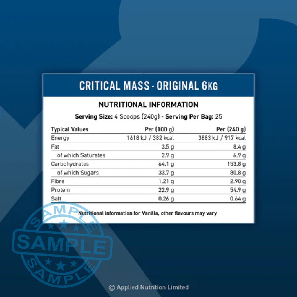 SAMPLE: Applied Nutrition Critical Mass ORIGINAL (120g per 1/2 serving)