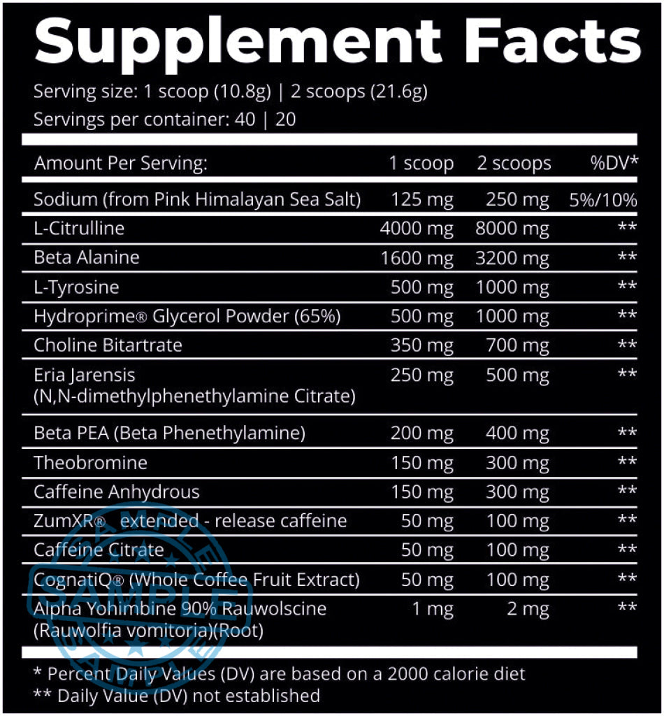 Ingredients: Beta-Alanine, L-Citrulline, Caffeine Anhydrous, L-Tyrosine, Choline Bitartrate