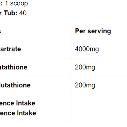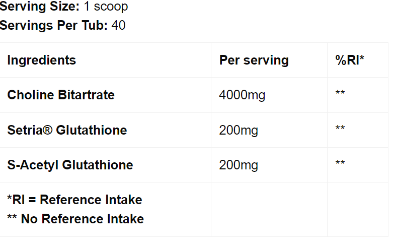 Ingredients: Choline Bitartrate, Setria Glutathione, S-Acetyl Glutathione