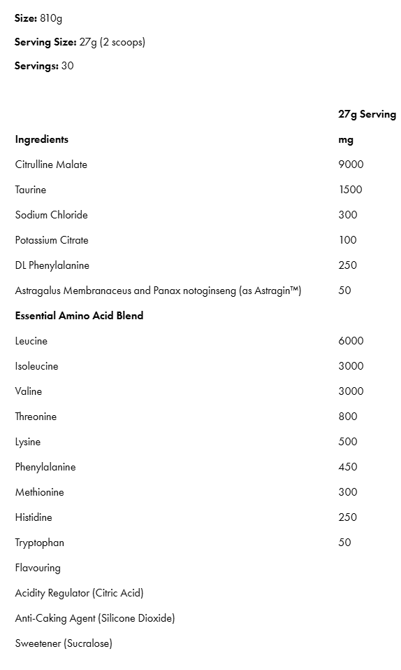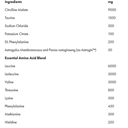 Ingredients: Leucine, Isoleucine, Valine, Threonine, Lysine, Phenylalanine, Methionine, Histidine, Tryptophan