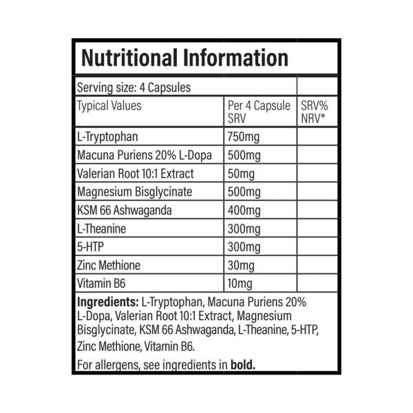 Ingredients: L-Trytophan, Veterian Root, Magnesium Bisglycinate, KSM-66 Ashwagandha, L-Theanine, 5-HTP, Zinc Methlone, Vitamin B6