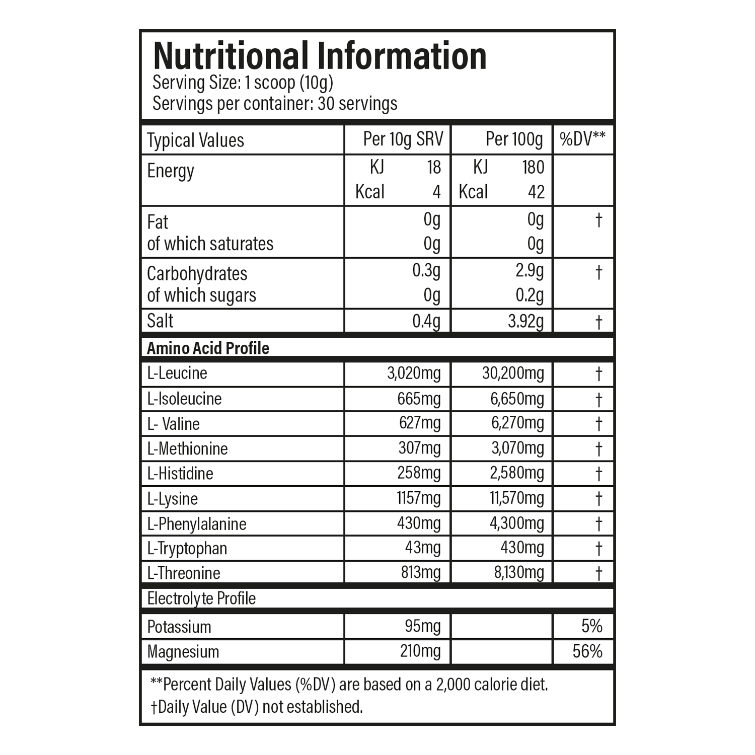 Ingredients: L-Leucine, L-Isoleucine, L-Valine, L-Methionine, L-Histidine, L-Lysine, L-Phenylalanine, L-Trytophan, L-Threonine, Potassium, Magnesium