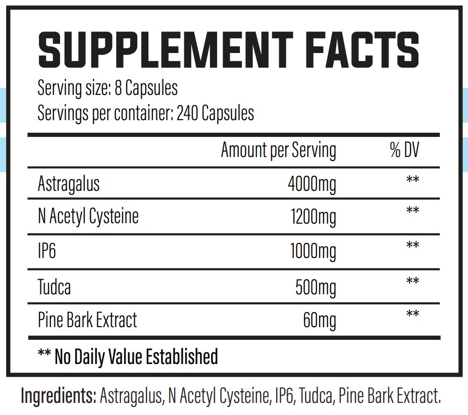 Ingredients: Astragalus, N Acetyl Cysteine, IP6, Tudca, Pine Bark Extract